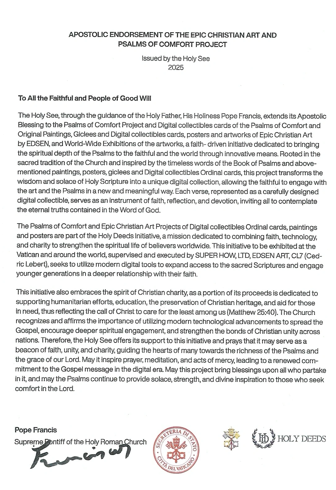 In the spirit of his call for a “Church that goes forth,” Pope Francis formally endorsed the mission-driven activities we carry out under the name HOLYDEEDS — a brand dedicated to sacred innovation and digital evangelisation. This papal blessing affirmed the value of our work in using art, technology, and immersive storytelling to engage hearts and minds across generations.